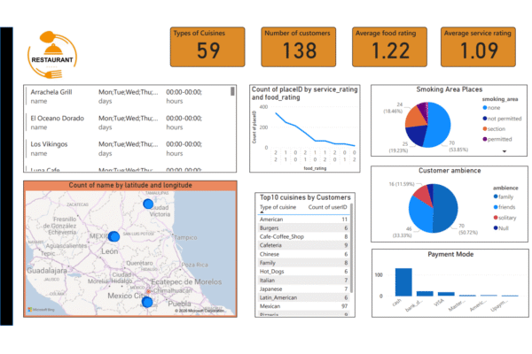 The dashboard also allows users to explore the most popular cuisines, analyze customer dining preferences (family, friends, or solitary), and evaluate restaurant attributes such as smoking areas and payment options. Additional visualizations include geographic mapping of restaurants, cuisine popularity rankings, and rating distributions for food and service quality. This project demonstrates practical skills in data visualization, customer behavior analysis, and interactive dashboard development using Power BI to better understand restaurant trends and customer preferences.